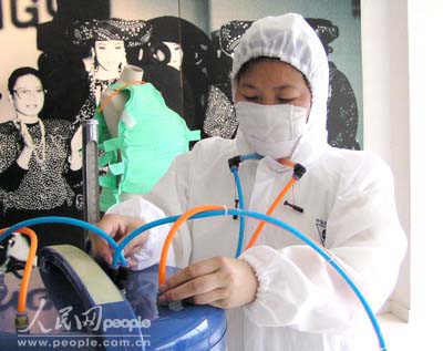 试穿调温隔离服 近日,专为抗击“非典”医务人员研制的防暑调温服装在重庆问世。在这种水冷式调温服内,特制的低温冷媒沿高强度特殊管路循环,将处于密闭隔离状态下的人员身体发热带走,达到物理调温的目的。