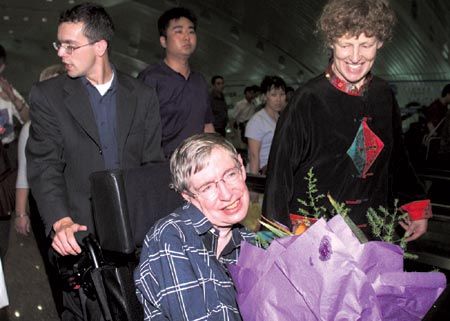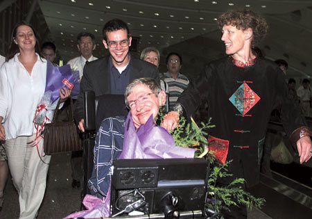 19时19分:由杭州至北京的CA1810次航班降落在首都机场。十几分钟后,随行医生和机械师马丁推着霍金走出机场通道,身穿蓝格长袖衬衫、深蓝色长裤的霍金安静地偏坐在轮椅上,蓝色的眼睛显得非常清澈,他还不时向周围的人群露出微笑。随后是穿着一身深色中式服装霍金的夫人爱莲娜女士和中科院杨乐院士。