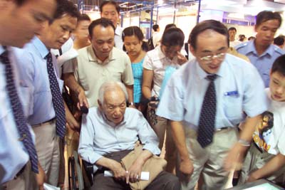 图为坐在轮椅上的国际数学大师陈省身先生在数学厅听取科技馆负责人的介绍。