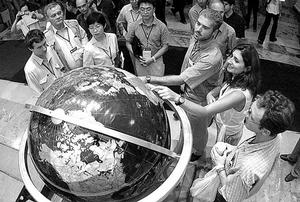 图为会议休息期间,与会代表来到大会堂大厅,在石制地球仪上寻找自己国家的位置。