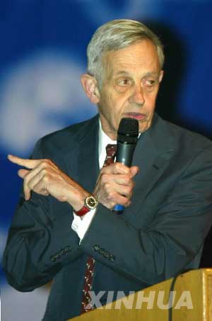 8月21日,正在北京参加2002年国际数学大会的诺贝尔经济奖获得者、著名数学家纳什在北京国际会议中心作题为“通过代理来研究博弈中的合作”的公众报告。纳什被认为是一位数学天才,他在21岁时就提出了纳什均衡理论,后来成为博弈论的两大基础之一。