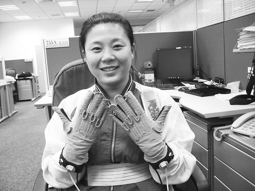 聋校教师正在通过数据手套向研究人员提供手语样本。 小张是2008年北京残奥会的志愿者。为了更好地为参赛的聋哑运动员服务,他想学习一下手语。不过,他首先面临的一个问题是:怎样才能又快又好地掌握常用手语呢?
