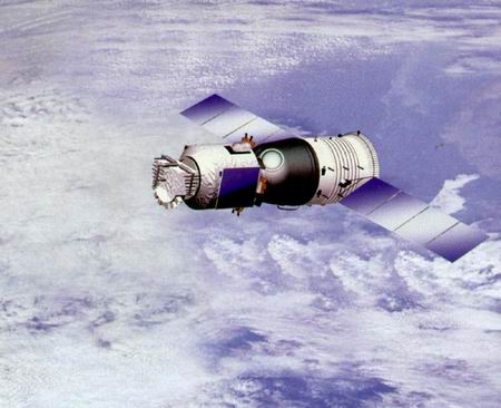这是用电脑制作的“神舟”飞船在太空围绕地球飞行时的模拟场景。