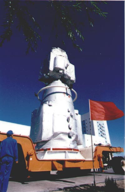 这是"神舟"飞船在完成全面测试后,向垂直测试厂房转运,与运载火箭实施对接。