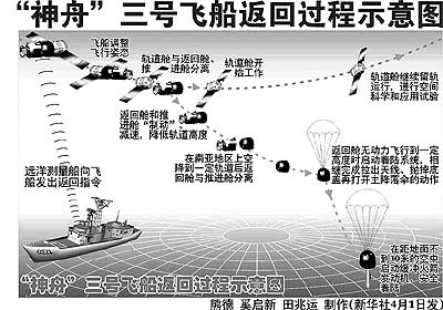 新华网北京4月1日电:载人飞船返回地面一般须经历四个阶段,即:制动飞行阶段、大气层自由下降阶段、再入大气层阶段和着陆阶段。