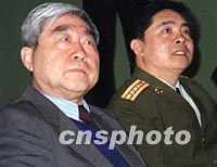 “神舟”三号飞船总设计师戚发轫(左)日前在“神舟”三号返回舱开舱仪式上,凝神观看舱中实验物品被工作人员一一取出。