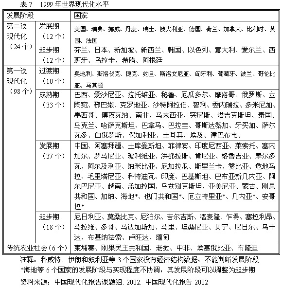 1999年世界上约有60多个国家及地区已经实现或基本实现了第一次现代化,其中,20多个国家进入第二次现代化的发展期或起步期;还有60多个国家及地区没有完成第一次现代化进程(表7)。2000年中国第一次现代化的实现程度为76%,1999年实现程度为94%,在108个国家中排第64位;如果保持1960~2000年第一次现代化的发展速度不变,中国实现第一次现代化还需要15年;全国34个地区发展不平衡;1999年中国第二次现代化的发展状况在108个国家中排第56位。《中国现代化报告2002》和《中国现代化报告2001》验证了第二次现代化理论的科学性。