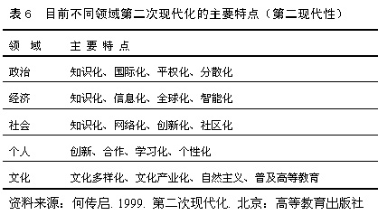 第二次现代化涉及人类生活的方方面面。在第二次现代化过程中,政治、经济、社会、个人、文化等领域的变化将有新的特点(表6)。