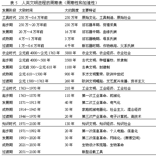1998年,中国学者何传启发表“知识经济与第二次现代化”一文,随后出版《第二次现代化--人类文明进程的启示》一书(何传启,1999),全面提出“第二次现代化理论”。第二次现代化理论认为,从人类诞生到2100年,人类文明的发展可以分为工具时代、农业时代、工业时代和知识时代等4个时代,每一个时代都包括起步期、发展期、成熟期和过渡期等四个阶段,人类文明进程包括4个时代16个阶段(表5);从农业时代向工业时代、农业经济向工业经济、农业社会向工业社会、农业文明向工业文明的转变过程是第一次现代化;从工业时代向知识时代、工业经济向知识经济、工业社会向知识社会、工业文明向知识文明的转变过程是第二次现代化;文明发展具有周期性和加速性,知识时代不是文明进程的终结,将来还会有新的现代化等。对于主要发达国家,第一次现代化大致经历200年(1763~1970年),第二次现代化将大致经历100年(1971~2100年)。