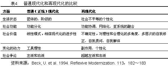 再现代化*(Reflexive Modernization)就是一个工业社会的创造性破坏的时代,创造性破坏的行为主体不是革命,不是危机,而是西方现代化的胜利。如果普通现代化(正统现代化)是工业社会形态对传统社会形态的解体和重构,那么,再现代化是另一种现代性对工业社会形态的解体和重构;普通现代化是从传统社会向工业社会的转变,再现代化是从工业社会向风险社会的转变;普通现代化是建立现代工业社会,再现代化是消解现代工业社会(表4)。再现代化是现代化的现代化。
