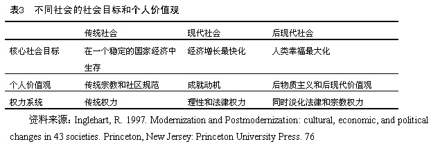 1997年美国学者殷格哈特教授的《现代化与后现代化》等著作的问世。殷格哈特教授把1970年以来发达国家发生的变化称为后现代化,把发展中国家发生的变化称为现代化。后现代化理论认为,从传统社会向现代社会(农业社会向工业社会)的转变是现代化,从现代社会向后现代社会(工业社会向后工业社会)的转变是后现代化。从现代化向后现代化的转变还包括政治、经济、性和家庭、宗教观念等的深刻变化,如从物质主义到后物质主义、从现代价值到后现代价值、从生存价值到幸福价值等(表3)。现代化的核心目标是经济增长,通过工业化和系统的技术应用来扩大有形产品;后现代化的核心目标是使个人幸福最大化,追求生活质量和生活体验。在专业化、世俗化和个性化方面,后现代化是现代化的继续。