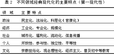 3、经典现代化理论发生范式危机。经典现代化理论是在20世纪50~60年代形成的。在英文里现代化一词大约出现在18世纪70年代。20世纪30年代,我国学者开始讨论现代化。20世纪50年代,美国一批社会学家、经济学家和政治学家相继开展了现代化研究。1958年,丹尼尔·勒纳出版《传统社会的消逝:中东现代化》一书,认为从传统社会向现代社会的转变就是现代化。1959年,美国社会科学研究会比较政治委员会召开了政治现代化讨论会。60年代西方陆续出版了一批有影响的现代化研究专著,现代化理论基本形成。在70~80年代,现代化理论面临诸多挑战,同时也得到全面发展,形成了五光十色的现代化理论。尽管这种理论存在许多固有的缺陷,并因此受到种种批评,但是,它仍然被认为是用来阐述工业革命以来人类文明的革命性变化的有力理论,其他任何一种社会科学理论都不可能完全取代它。学者们称之为经典现代化理论。经典现代化理论并不是一个单一的理论,而是不同领域、不同学者关于现代化研究的理论成果的统称。在不同领域和不同地区,现代化具有不同的特点(表2)。