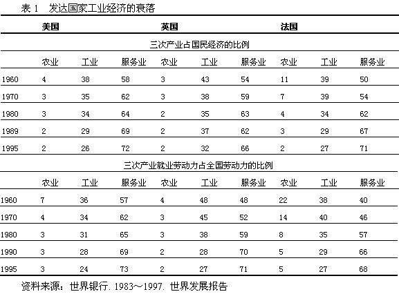 1、世界现代化方向发生重大转折。20世纪70年代以来,发展中国家继续进行以工业化、城市化和民主化为特征的经典现代化;发达国家则进入以非工业化(工业转移+工业升级)、非城市化(城市扩散+信息化)、知识化和全球化为特征的新现代化轨道。工业经济衰落(表1),知识经济崛起,反映了世界现代化方向的重大变化。