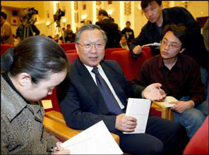 中国科学院院长路甬祥(左二) 在“中国科学家人文论坛”开幕式休息期间接受记者采访。