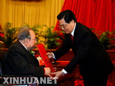 中共中央总书记、国家主席、中央军委主席胡锦涛向获得2007年度国家最高科学技术奖的中国科学院院士吴征镒颁奖。 新华社记者马占成摄