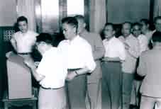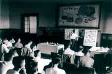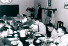 学部成立大会分组讨论工作报告。图为生物学分组讨论。右起:动物学家王家楫、实验胚胎学家童第周、动物学家伍献文、昆虫学家刘崇乐、动物学家陈桢、动物学家秉志。