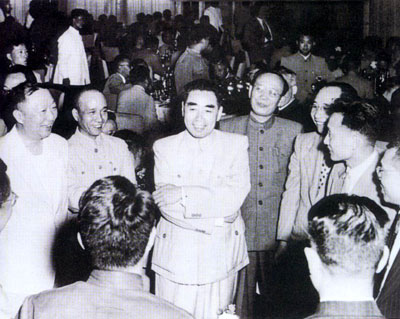 学部成立大会后,学部委员们即投入制定我国《十二年科技发展远景规划》的工作。图为1956年周恩来、李富春、聂荣臻、郭沫若与制定科学规划的科学家在一起。
