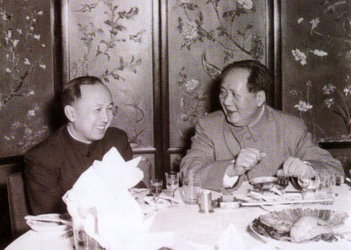 建国初期,一批海外学有成就的科学家陆续回国,成为中国科学院的学科带头人。图为毛泽东主席会见冲破重重阻挠,返回祖国的力学家钱学森教授。