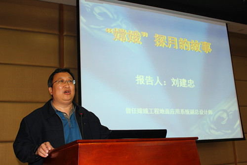 上午十点,地化所研究员刘建忠在报告大厅为参观者带来一场名为《“嫦娥”探月的故事》的科普报告。报告中,刘建忠用大量翔实的数据、生动的图片,深入浅出地向参观者介绍了我国嫦娥工程的历史,生动地讲述了我国第一轨月面图像、嫦娥一号最后一轨图像、我国第一张全月影像图、目前世界上分辨率最高覆盖最全的全月球影像图等各种科学知识背后的故事。