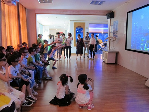 分别播放了《海龟之旅》海洋科普3D影片;《大堡礁》、《蓝地球》、《珊瑚礁探奇》等海洋知识音像片。