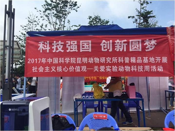 今年科技活动周的主题为“科技强国,创新圆梦”。在启动仪式现场,来自科研院所、科技创新企业的新成果和新技术精彩亮相,让市民体验到科技创新的无限魅力。昆明动物所通过通俗易懂的科普展板,向市民广泛宣传实验动物方面的基本知识,以“向为人类健康献身的实验动物致敬”为主题开展了有关实验动物福利伦理、特色动物实验平台和与昆明实验动物科普精品基地相关的公益科普宣传活动。