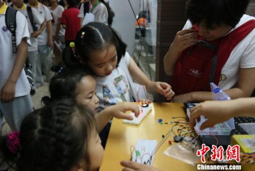 中国科学院物理研究所20日举办了以“爱上物理,改变世界”为主题的公众科学日,图为小朋友在进行物理实验。中科院物理所供图