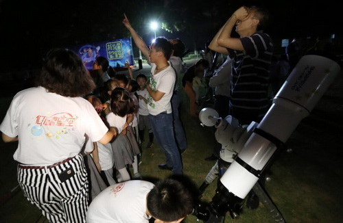下午三点多,紫金山天文台陈向阳、王科超和南京天文爱好者协会的工作人员一起共携带九台望远镜来到南京体育学院的中央体育场选择合适的观星地点。下午四点,一千多名师生和家长在活动场地上陆续“安营扎寨”。当小朋友们在搭帐篷做游戏的时候,紫金山天文台和南京天文爱好者协会的人员就已经开始紧张地组装调试几十公斤重的仪器,为观测做准备了。晚上七点多,夕阳西下,距地球7亿公里的木星已经可以透过天幕隐约可见了。工作人员将各自的望远镜对准木星,木星上的暗色的条文清晰可见,四颗伽利略卫星也点缀在木星周围,此时的木星俨然是天空中最美丽的风景。等候在一旁的小朋友们全都兴奋雀跃,激动不已。在工作人员细心指导帮助下每一位小朋友都通过望远镜观测到了美丽的木星。为缓解他们排队时候的焦急,工作人员还指导大家抬头认识星空,在老师的指引下,大家从天空中认出了狮子座、双子座,室女座,北斗七星等星座,还了解了不同季节星空变化的特征和原理。除此之外,工作人员现场还教会了大家使用星空软件,帮助孩子们学习星空知识。通过讲解和实际观测,小朋友们学习到了丰富的天文知识。家长表示这样的活动拉近了孩子与家长的距离,也拉近了孩子与自然的距离,仰望星空使他们心胸开阔。观星活动得到了学校、学生和家长的一致好评。