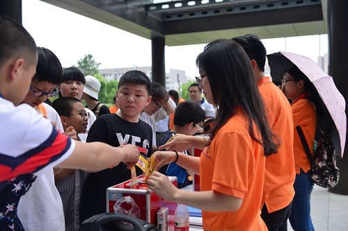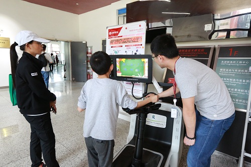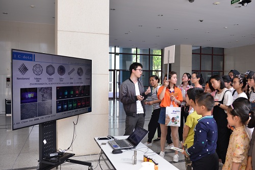 上午进行的7个趣味实验经过精心筹备,涵盖了新材料技术,如纳米荧光碳点、石墨烯薄膜;先进制造技术,如五轴联动水刀加工、3D打印技术;还有生命医学相关的康复机器人和与生活紧密相关的趣味催化实验、电子显微镜观察。这些实验兼顾趣味性和高端科技,兼顾“眼睛看”和“动手做”。趣味催化实验和纳米荧光碳点,让参加的学生亲手使用取液枪,观察加入指示剂后的颜色、物相变化,带来直接的感官体验。五轴联动水刀加工,迎合“520”特殊日子的主题,给参观学生们送上了“丘比特”形状碳纤维片,制造了浪漫的气氛,得到了小参观者们的追捧,果断拿下了今年的“最佳实验”奖。3D打印技术的展品形状丰富,出现了中国古代童话葫芦、同心球的形象,还出现了现代汽车轮轴和涡轮叶片的形象。康复机器人有些小朋友体验了一次还再来一次,感叹操作时间太短。石墨烯薄膜与LED阵列复合材料神奇的会有“雾化”的效果,同学们问题不断,有些同学还想买块回家装饰玻璃。