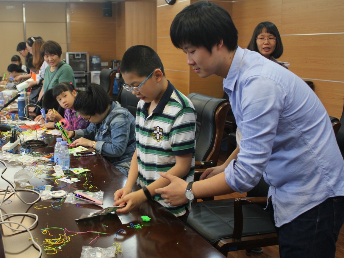 童话故事《神笔马良》里,穷人们需要什么,马良用神笔描画一下就能出现,助理研究员王剑磊在纳米楼二楼用3D打印笔带领孩子们感受童话故事般的神奇,帮助孩子们把想象力从纸张上解放出来,用3D打印笔描绘制作自己想要的模型。