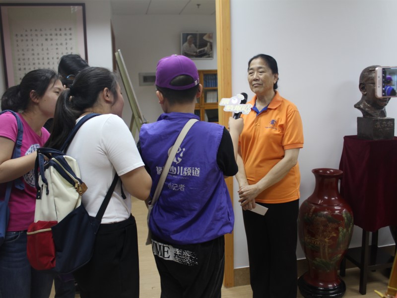 卢葛覃在卢嘉锡纪念陈列室里接受小记者团的采访