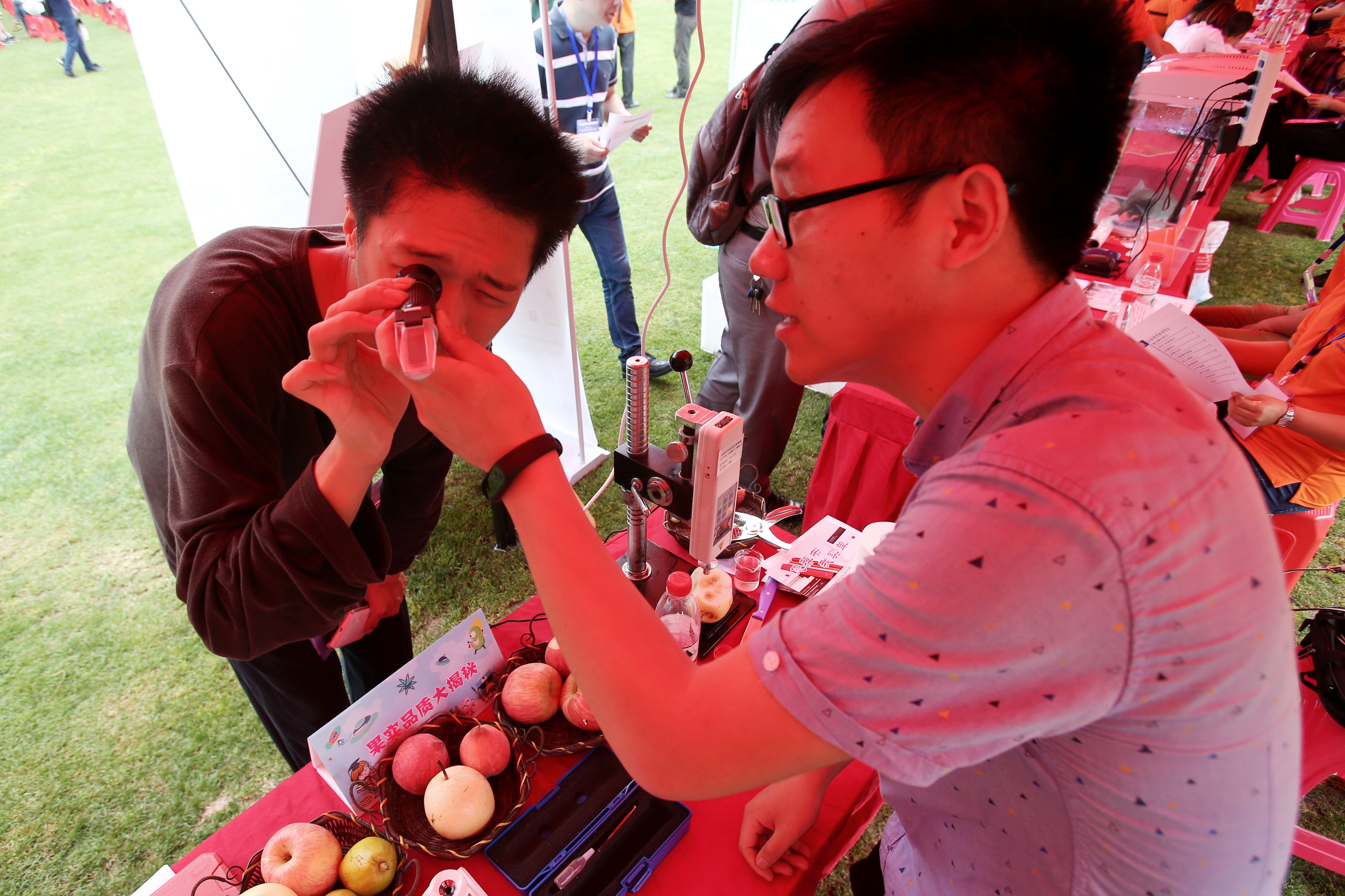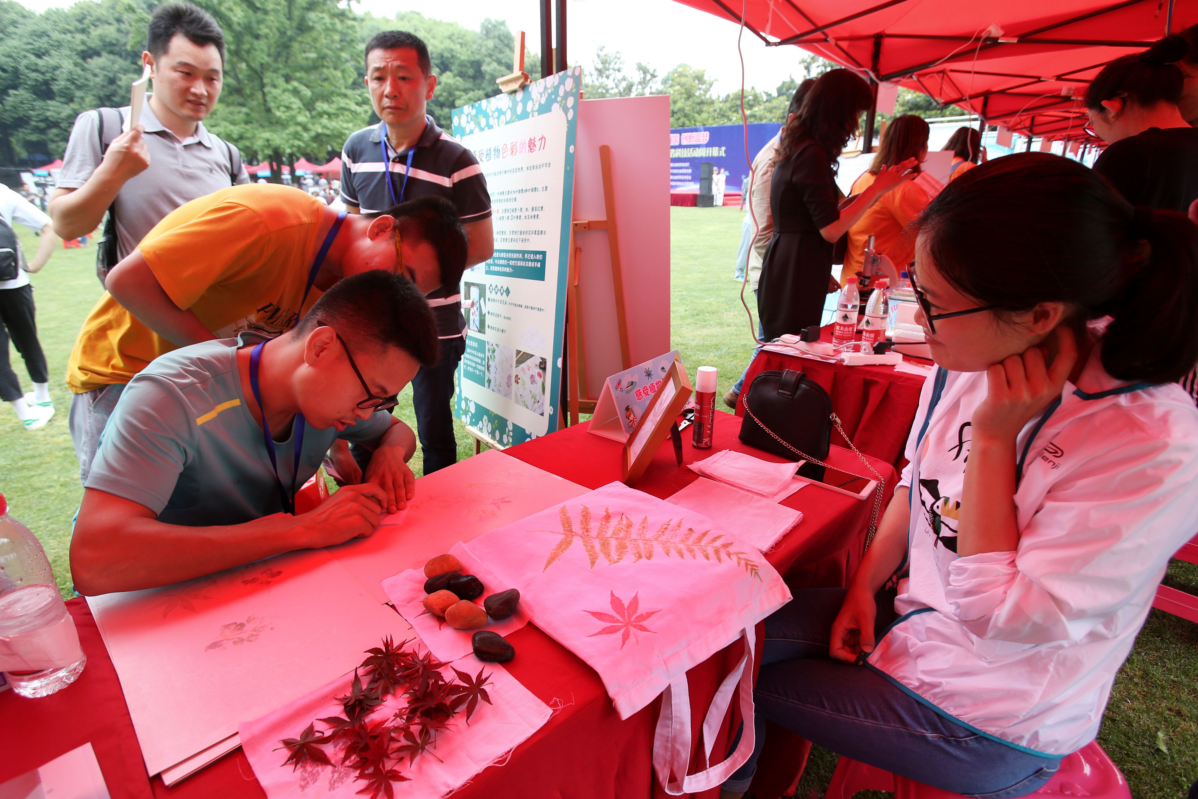 在启动仪式现场,武汉植物园结合自身的学科特点及项目优势,通过科普展板,科学小实验和发放宣传资料等形式向公众介绍了常见保健品中的重要成分“螺旋藻”、“小球藻”和“虾青素”,把看似高大上的成分以直观的方式展示给公众。“果实品质大揭秘”活动通过果实硬度、可溶性固体形物和果形指数三个指标揭示果实届中“高富帅”的评价标准。“感受植物色彩的魅力”小实验邀请公众通过鹅卵石敲击的方式将新鲜叶片或花朵的形状与色彩敲染在棉布上,直观感受“花花世界”背后的大功臣“植物色素”。“植物茎中的水渠和‘蜜’道”实验带着公众一起用显微镜去观察植物茎的内部结构,体味植物根茎的美丽与神奇,感受被子植物运输水的水渠-导管和运输蜜(营养物质)的蜜道-筛管。为了方便公众更好的了解药用植物及其对人类健康的作用,植物园展出了蒲公英、萱草、半夏、虎掌半夏、紫苏、薄荷等活体药用植物。同时,工作人员还自制小口诀,帮助公众理解生活常备药物甘草、姜、芍药、葛根、大黄和桂枝等的药用及药理。武汉植物园展出的一系列贴近民生的科普活动既展示了科学魅力又体现了植物园特色,吸引了大批社会公众的观看与参与。