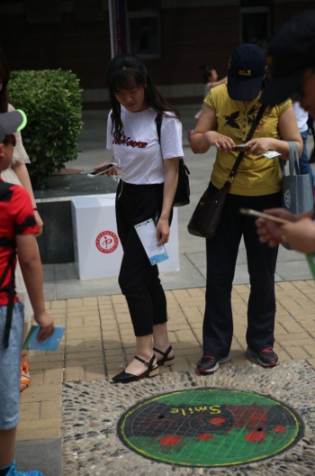 参观者在中科院物理所的“网红井盖”边留影。(照片由中科院提供)
