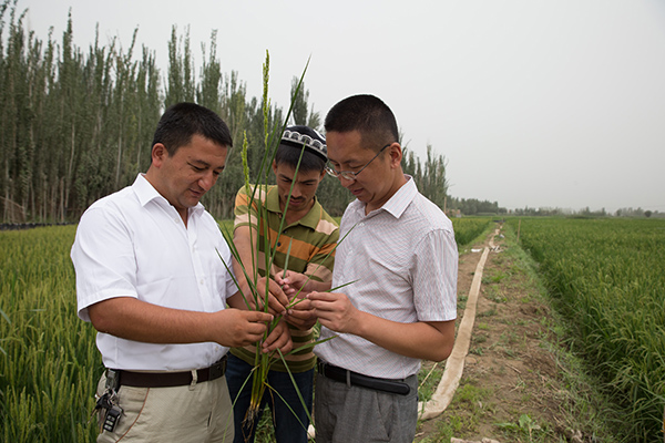 中科院新疆生态与地理研究所博士张波(中)和墨玉县加罕巴格乡农技站站长阿不力米提(左)、农技站干部张明(右)在墨玉县加罕巴格乡恰尔巴格村的水稻试验田田头(8月1日摄)。