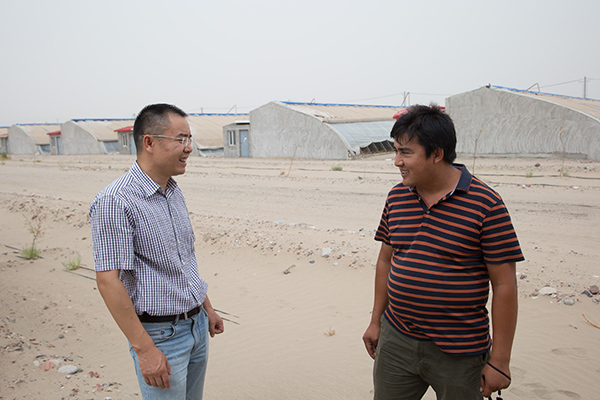 在新疆和田县国家农业科技园区和谐新村,中科院新疆生态与地理研究所王平副研究员(左)与当地村民艾力交流大棚建设技术(7月31日摄)。