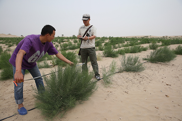 中科院新疆生态与地理研究所李丙文副研究员(右)在策勒县策勒乡托帕艾日克村梭梭肉苁蓉试验示范基地记录梭梭的成长情况(8月2日摄)。