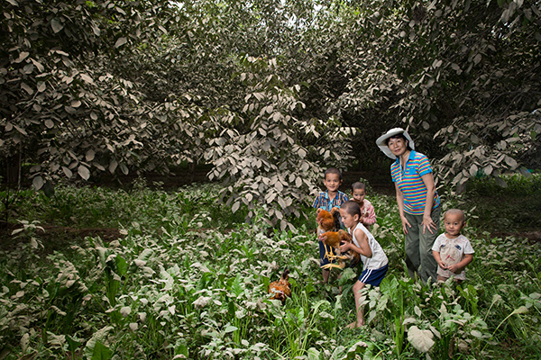 中科院新疆生态与地理研究所李利副研究员在和田地区墨玉县奎雅镇萨亚提村和村民的孩子在核桃林下(8月1日摄)。