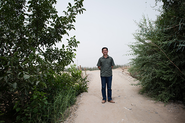 桂东伟副研究员在中科院新疆生态与地理研究所策勒国家站实验基地(8月2日摄)。他选取墨玉县加罕巴格乡巴西恰瓦格村为示范村,并在中科院新疆生态与地理研究所策勒国家站展开相关研究。通过筛选和改良核桃品种,优化种植模式,并进行高产管理。今年3月,他们在策勒站种植20亩核桃,目前长势良好。