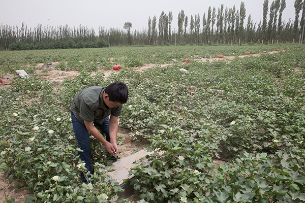 桂东伟副研究员在中科院新疆生态与地理研究所策勒国家站实验基地向记者介绍绿洲农田温室气体的收集(8月2日摄)。