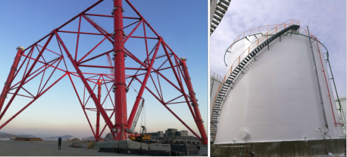 左:世界最高输电塔涂装工程;右:大型原油储罐整体防腐涂装