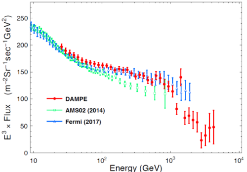 中国科学院紫金山天文台常进科研团队在中科院空间科学战略性先导科技专项支持下,利用暗物质粒子探测卫星“悟空”采集到的约150万颗25GeV以上的电子宇宙射线数据,获得了世界上迄今最精确高能电子宇宙线能谱,首次直接测量到电子宇宙射线能谱在~1 TeV处的拐折,初步显示在~1.4 TeV处存在能谱精细结构,一旦该精细结构得以确证,将是粒子物理或天体物理领域开创性发现。相关成果于2017年11月在《自然》杂志在线发表。