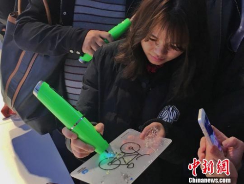 在上海光机所南京先进激光技术研究院,记者见到“神笔马良”的故事成为“现实”。图为一家企业的工作人员演示如何用光固化3D创意打印笔“画出实物”。张素摄