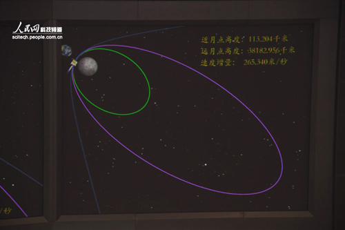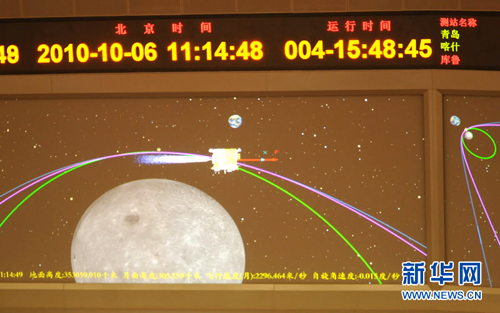 指控大厅显示屏上显示嫦娥二号卫星第一次近月制动...