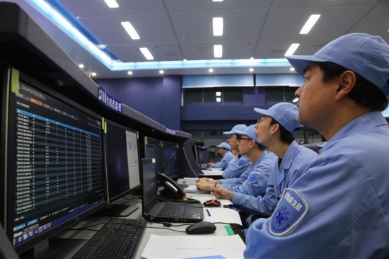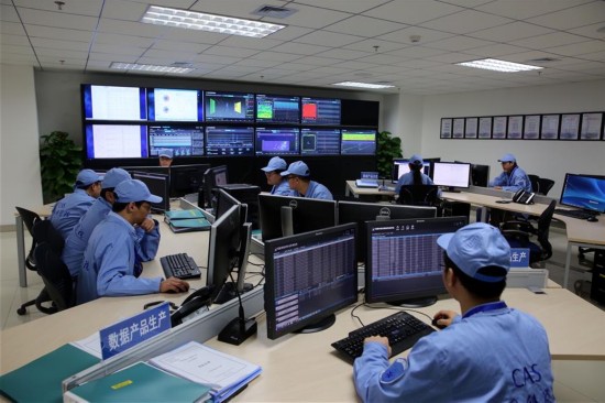 12月24日,中科院国家空间科学中心工作人员在空间科学任务大厅监视卫星综合状态。