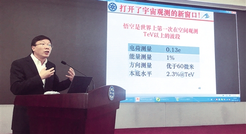 “悟空”卫星的首席科学家、中科院紫金山天文台副台长常进在介绍暗物质粒子探测卫星的科学成果。经济日报 沈慧摄