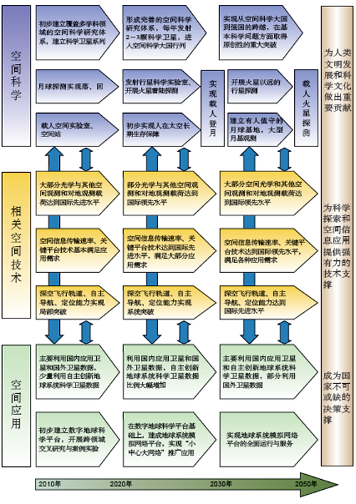 在科学方面,针对黑洞、暗物质、暗能量和引力波的直接探测,太阳系的起源和演化,太阳活动对地球环境的影响及其预报和地外生命探索四大科学问题,实施空间科学卫星和探测计划;在对地观测与综合信息应用方面,发展先进的地球系统综合要素观测系统,构建数字地球科学平台与地球系统网络模拟平台;在空间技术方面,围绕超高分辨能力、超高精度时空基准、临近空间飞行、深空超高速与自主航行、空间高速通信、人类空间生存和活动能力等六个重要技术方向,突破关键和瓶颈技术,具体安排是:2020年前后,初步建立以空间科学卫星系列为基础的空间科学研究体系;发展大型综合对地观测系统、构建数字地球科学平台,实现全国组网;突破人在近地轨道空间站长期生存保障技术、多谱段多用途2m口径空间望远镜技术,并实现相应高速数据传输;初步具备全自主天文导航的星际飞行能力;在临近空间建成大型零压式高空气球和第一代平流层飞艇。2030年前后,形成完善的空间科学研究和探测体系,获取第一手探测数据,取得重大创新成果,进入世界空间科学大国行列;进一步完善大型综合对地观测系统,建成地球系统模拟网络平台,实现亚洲联网;实现载人登月,建立月球基地;超高精度时空基准达到国际先进水平;完成口径4m的可见与红外、主镜可折叠和展开的超高分辨空间望远镜;深空探测器实现高效星际航行和高精度自主导航,可探测火星以远的行星;突破大中型超压气球技术,建设南极极地气球站,实现经常性的探空火箭综合实验,完成第二代平流层飞艇的发展、定型和应用推广。2050年前后,在宇宙、太阳系、物质运动规律和生命起源等基本科学问题方面取得原创性重大突破;地球系统网络平台实现全球联网,开展对地球系统变化与重大灾害的模拟、预警预测;载人飞行从月球基地飞向更远的行星;无人探测器飞出太阳系进入宇宙空间;实现10m孔径干涉式超高分辨率成像;突破激光超高速通信技术,数据通信速率比当前提高两个量级;建立以大型超压式高空气球为基础的平流层高空站,发展新一代平流层飞艇,开展组网应用,进入空间的方式更加廉价和高效。 |