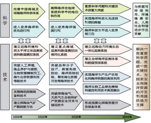 聚焦海洋资源开发和保障海洋环境安全两大领域,在物理海洋、海洋地质、海洋生物、海洋生态等四个重要科学方向上,围绕海洋监测、海洋生物、海洋资源开发与利用等三大重要技术,解决一批重要科学问题,突破一批关键技术。具体安排是:2020年前后,完善中国海域及邻海的海洋科学体系,建立近海环境和西太平洋立体监测系统和数值模拟系统,突破海洋生物基因资源利用、人工养殖、渔业养护与捕捞、生物资源精制加工、海水淡化及化学资源利用等海洋新技术,发展海底探测装备和技术,建立深海油气矿产勘探新方法。2030年前后,阐释海洋在地球系统科学中的地位和作用,建立重点海域监测和数值模拟四维同化系统,突破品种分子设计、病害免疫防治、海洋药物创制、稀有海水化学资源开发等海洋技术,突破深海油气、天然气水合物和矿产资源安全开采与储运技术。2050年前后,海洋科技水平进入世界前三位。建立近海动力环境生态一体化监测系统、全球海洋监测体系和数值预报系统,实现海洋水产生产农牧化和海水化学资源的高效利用,海洋生物工业绿色精制和基因利用技术高度融合,形成规模化深海资源开发装备体系,持续有效地支撑我国的海洋强国地位。 |