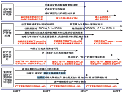 在系统认知我国岩石圈独特演化历史的基础上,重点解决巨量成矿物质聚集过程、矿床的时空分布规律、成矿模型与找矿模型的关系等三大科学问题,重点突破深部矿产资源探测、矿产资源高效清洁利用、重要紧缺矿产替代资源、矿产资源循环利用等四个重要技术方向,加强相关技术集成、试验示范和应用。近中远期的战略安排是:2020年前,确定我国主要成矿区带的成矿规律和找矿远景;突破元素野外现场精确测定技术、航空物探技术、成矿信息高精度提取技术、东部地区深至2000m左右高分辨地球物理探测技术;提高重点矿山的矿产资源采、选、冶回收率和共、伴生矿床综合利用率;开展紧缺矿产替代资源技术的先导性研究和开发;突破废旧金属高效回收利用技术。2030年前,建立我国大陆成矿理论体系;突破西部地区地下2000m以内矿产资源高效高精度探测技术;突破低品位矿和尾矿高效清洁利用技术;突破非水溶性钾资源的肥料化技术。2050年前,揭示地球系统与成矿系统的关系;突破地下3000~4000m矿产资源探测技术;形成矿产资源高效清洁利用的整套核心技术;突破硅酸盐纤维替代大宗金属材料技术。