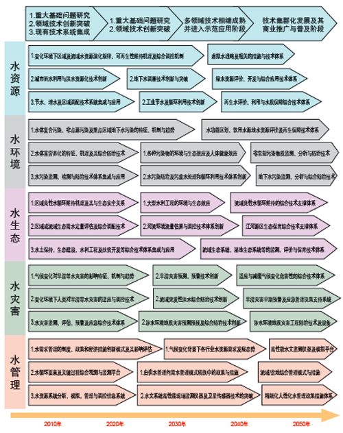 在水资源、水环境、水生态、水灾害、水管理等方面系统认知的基础上,重点解决三大科学问题,突破五项关键技术,建设三个综合集成平台。具体安排是:2020年前后,以提高水资源利用效率与改善水质和保证水的安全供给为重点,解决流域水体复合污染机理问题,突破水资源高效与循环利用、水体富营养化的综合防治等技术问题,初步建立水量水质监测与评估、水灾害预警、水需求管理与信息系统等三个综合集成平台。2030年前后,基本解决流域水生态恢复原理及其科学问题,重点突破河流环境流量与调控、突发性重大水灾害综合防治等关键技术,形成我国基于需求管理的水科技管理体系。2050年前后,解决全球变化下的水循环演化规律的科学问题,解决地下水污染治理与生态恢复,实现水的良性循环。 |