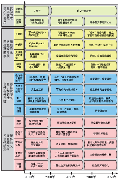 发展泛在的信息科学技术,构建泛在的信息网络,重点围绕无处不在的网络信息技术应用,信息基础设施升级换代,信息器件、设备与软件的变革性突破,新信息科学与前沿交叉科学等四个层次进行战略安排:2020年前后,突破低成本器件和系统设计技术,物理世界的新型感知机理、语义检索和分析技术等。发展可扩展、高可信的下一代互联网和自组织的无线传感网络,积极推进三网融合。按照延续、扩展和跨越摩尔定律三条途径发展微电子技术和新型信息器件,突破多核芯片设计、片上光互联和片上大规模光计算、艾级(1018)超级计算技术等。突破网络科学、分布式交互算法设计理论、大规模工业软件、自然的人机界面、蛋白质结构预测等;构建“平行社会”系统。2035年前后,突破网络信息理论、网络算法理论、网络计算模型等。建立可持续网络服务体系,突破低功耗芯片和系统设计、实用的知识本体与知识网格技术等。实现超越TCP/IP的未来网络和具有感知与认知能力的无线通信系统,突破分组交换的全光网络技术等。突破纳米、量子等变革性器件和电路技术,实现泽级(1021)超级计算,软件开发成本平均每两年降低50%。突破可信计算系统、情感理解技术等;构建人类基因组差异数据库。2050年前后,建立普适的信息科学,计算成为自然系统、人造系统、社会系统领域的基本思维方式;构建可持续发展的计算基础设施和应用服务;继计算与网络融合、计算与物理系统融合之后,脑科学与认知科学取得重大突破,实现计算与智能的融合,形成较成熟的信息科学。 |