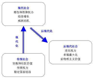 美国学者殷格哈特是后现代化理论的一个代表人物,也是世界价值观调查项目的负责人。他分析了世界价值观调查获得的大量数据和结果,写成《现代化与后现代化:43个国家的文化、经济和政治变迁》(Inglehart, 1997)一书;该书是后现代化理论的代表作之一。殷格哈特认为,历史发展不是线性的,从传统社会向现代社会的转变是现代化,从现代社会向后现代社会的转变是后现代化(图2-5);1970年以来工业化国家发生的变化是后现代化,发展中国家发生的变化是现代化;从现代化向后现代化的转变包括政治、经济、性和家庭、宗教观念等的深刻变化,如从物质主义到后物质主义(表2-7)、从现代价值到后现代价值、从生存价值到幸福价值;现代化的核心目标是经济增长,通过工业化和系统的技术应用来扩大有形产品;后现代化的核心目标是使个人幸福最大化,追求生活质量和生活体验;在专业化、世俗化和个性化方面,后现代化是现代化的继续。文化变迁具有路径依赖性,后现代化的文化变迁包括后现代主义的兴起。后现代主义可以分为三类:(1)反对现代性的后现代主义,反对理性、权威、技术和科学;(2)主张复兴传统的后现代主义,认为传统性有积极意义;(3)提倡新价值和新生活的后现代主义,主张更加宽容的伦理、性行为和个人选择。